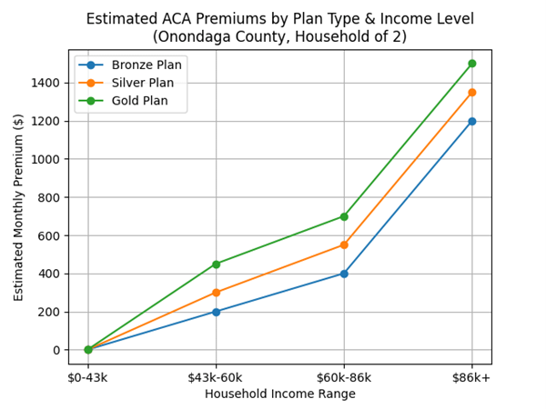 This creates key thresholds where modest income changes can significantly increase costs. The chart below shows details of these breakdowns in Onondaga County with the additional graph showing more detailed plan breakdowns for a household of two.