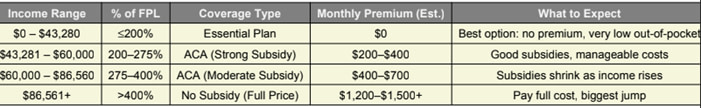 • Under ~$43,000: Essential Plan (minimal or no premium)